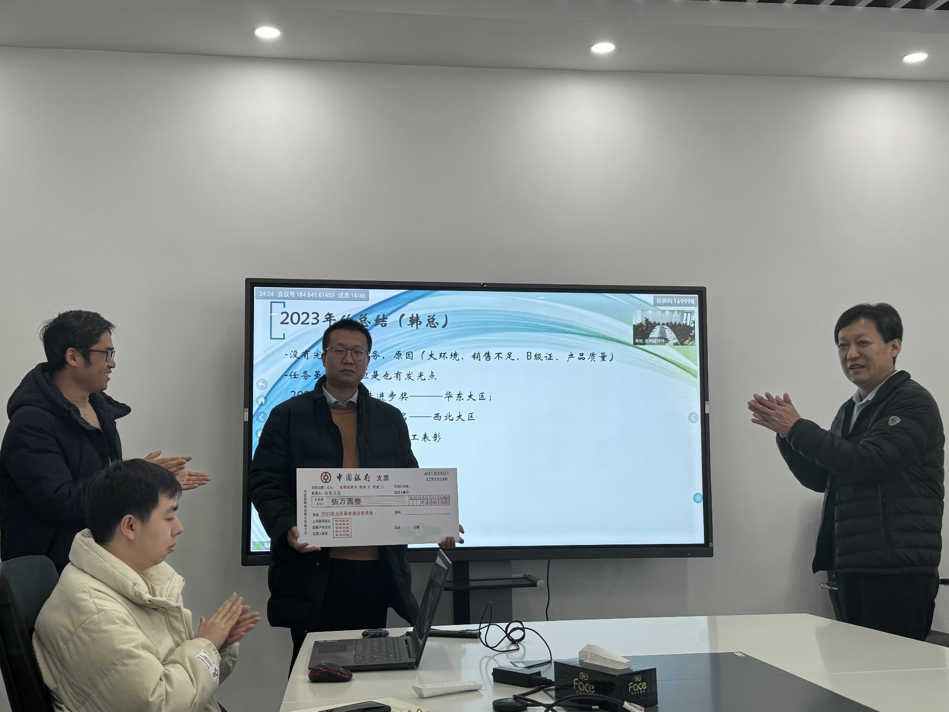 接着,新任总经理韩刚先生,对2023年公司的整体运营情况,从市场大环境及公司内部因素等角度进行了深度分析和总结,并为去年销售业绩出众的大区经理颁发现金奖励。与此同时,也为过去两年因疫情原因没能颁奖的年度优秀员工,隆重举行了颁奖仪式,颁发优秀员工证书及奖品,鼓励先进、鞭策落后。